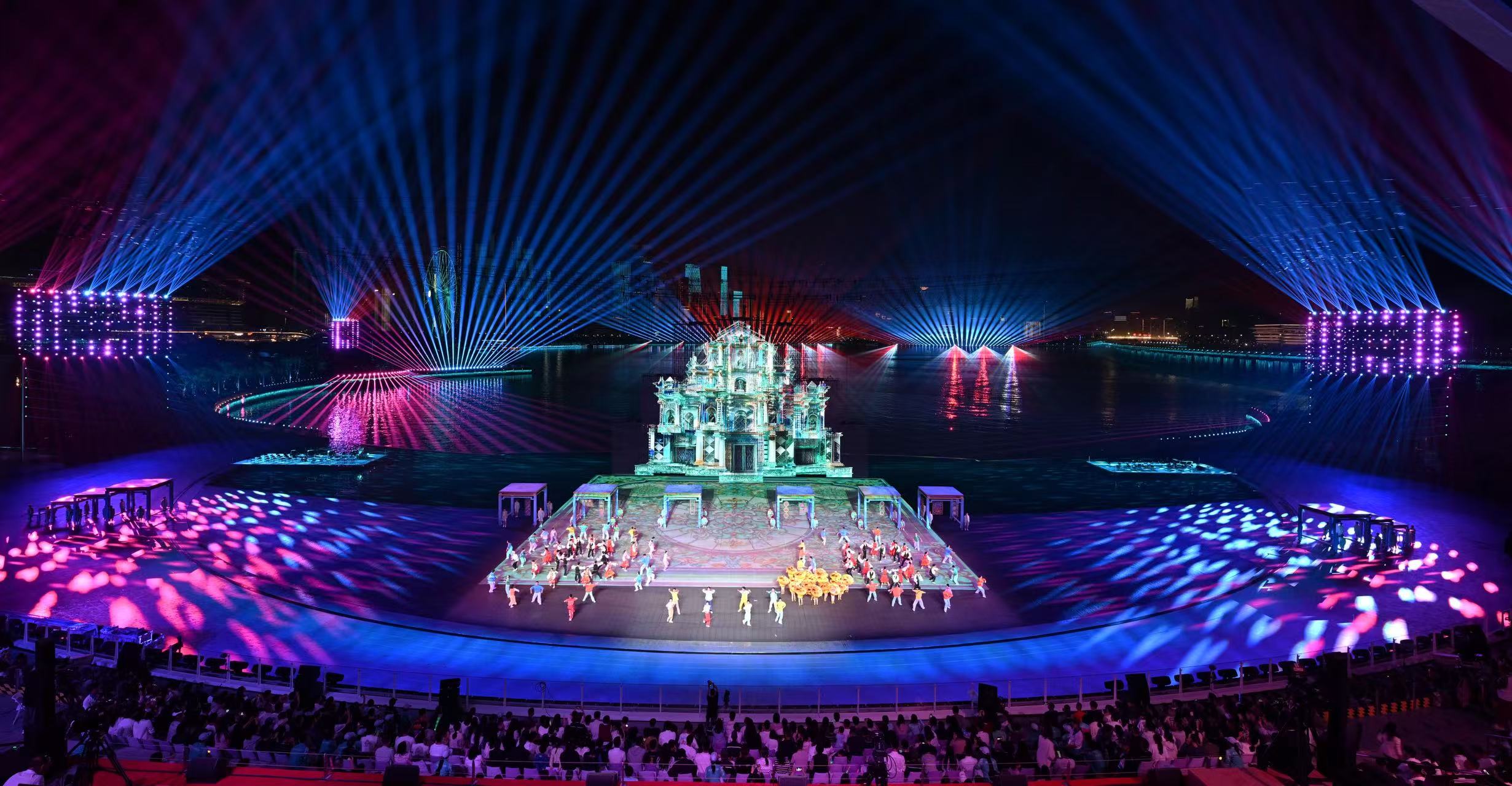 舞臺最大的亮點之一,就是創新性地將陸域看臺、水域舞臺與城市背景融為一體,打造出名副其實的“城市全景閉幕式”。而燈光則成為串聯這一切的“點睛之筆”,它將不同元素巧妙結合,最終構成了這場震撼全場的視覺盛宴。