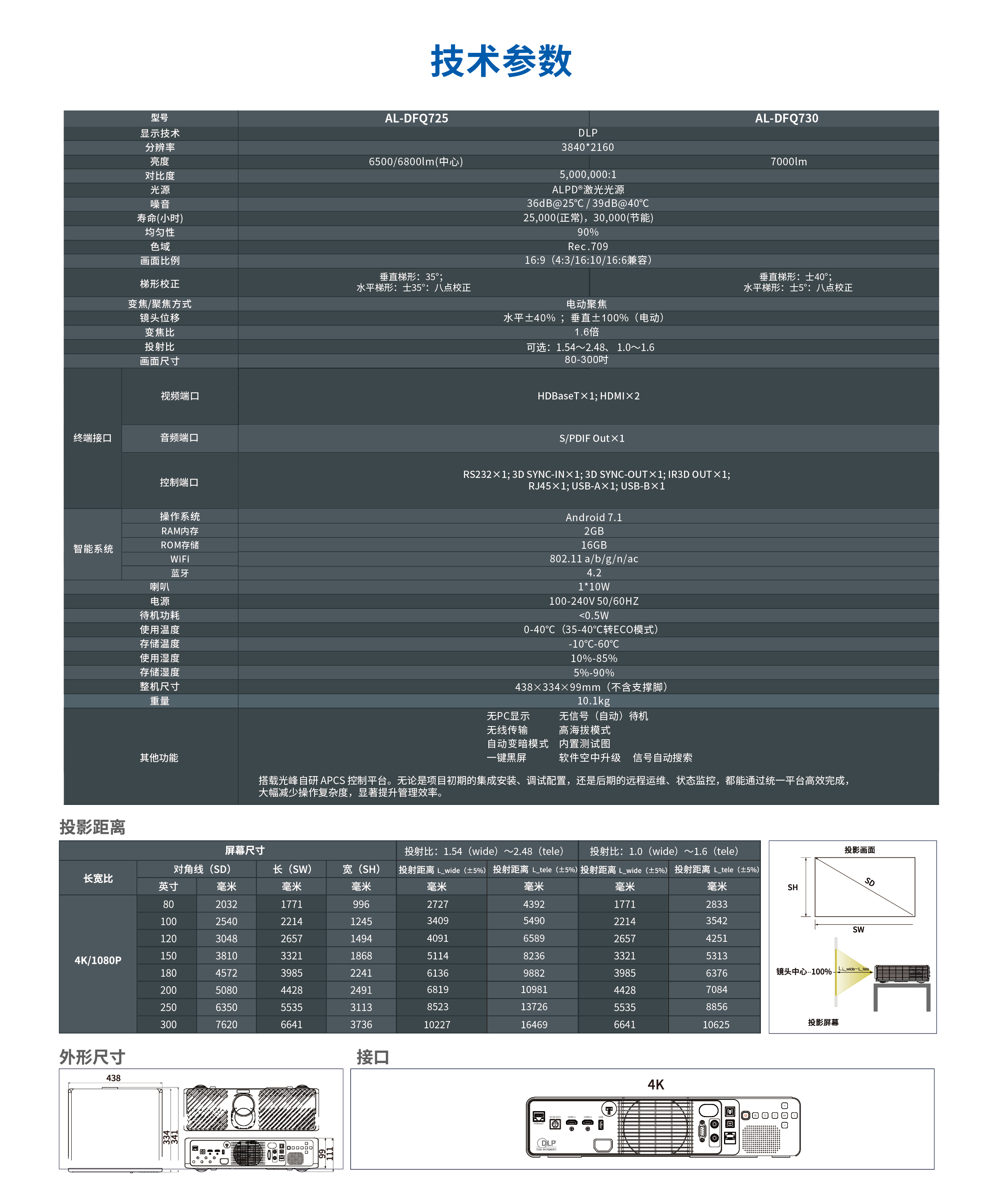 電動聚焦,投射比:可選:1.54~2.48、 1.0~1.6